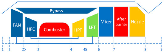 In Figure 4, the real engine is a component level nonlinear model that can accurately reflect the operation of the real engine in full operating envelope. In the simulation model, control noise is added to the control inputs. The diagram of the engine structure and cross-section definition is shown in Figure 5.