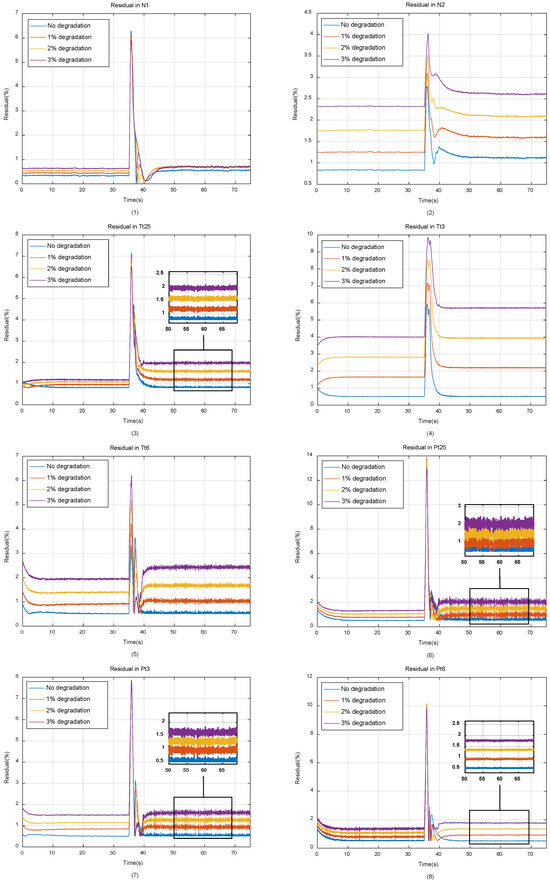 As can be seen from Figure 6 and Figure 7, as the degradation of engine model component performance evolves, the output residuals between the piecewise linear model and the nonlinear model will gradually increase, which is caused by underdetermined estimation, reducing the tracking accuracy of the model. It should also be noted that since the simulation was carried out under closed-loop conditions, the accuracy of the controlled variable N1 is guaranteed by the PID controller, so it is less affected by the performance degradation of the engine components.