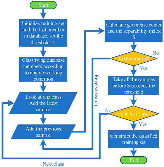 The GMM module determines whether new data elements need to be generated in each flight cycle of the engine, and all database elements are arranged in the order of generation time. Since the data elements are obtained under multiple steady-state conditions, it is necessary to classify the data according to the engine operating conditions first, and then the algorithm searches in reverse order in each class to ensure that newer elements can be added to the training set. Finally, the separability index of each class of data is calculated, respectively, and the qualified data in all classes are added to the training set. The algorithm flow chart for generating a qualified training set of neural networks is shown in Figure 8.