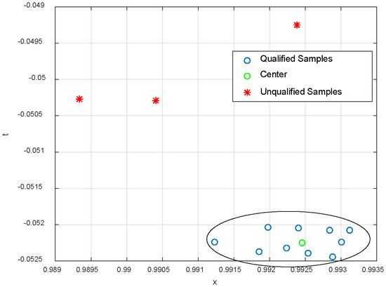 In Figure 10, the blue circles represent the qualified training sample obtained according to the separability index, the green circle represents the center of the qualified training set, and the red asterisk represents the training sample judged as unqualified by the separability index. In Figure 10, the X-axis is the main fuel flow, and the Y-axis is the Tt3 output residual. All data in the figure were normalized.