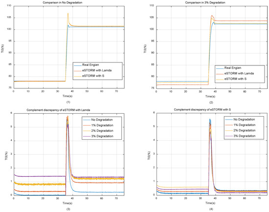 In Figure 11, (1) is the working process of the engine model without degradation. As can be seen from the figure, at this time, since there are only data elements representing a brand new engine in the database, the eSTORM model using memory factor and separability index S can both track the engine output variables accurately. (2) refers to the working process of the engine under 3% degradation condition. (3) and (4) show the tracking errors of eSTORM using the two methods under different degradation conditions, respectively. As can be seen from the figure, as the engine degradation evolves, the tracking accuracy of eSTORM using memory factor decreases, while that using the separability index remains high under different health conditions. The comparison of the tracking errors of all output variables under 100% operation condition is listed in Table 2.