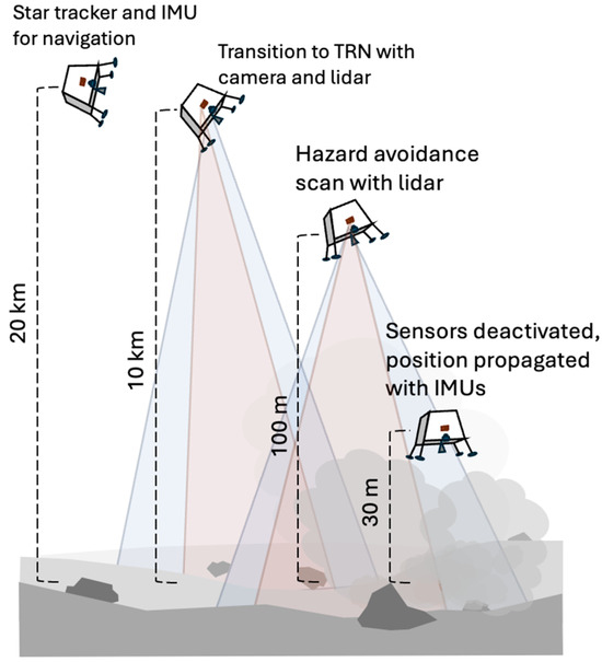The recent robotic landings of Chang’e 3–6, Chandrayaan-3, IM-1, and SLIM each employ a similar EDL profile, illustrated in Figure 1 [2,4,5,6]. Following descent orbit insertion, the lander begins powered descent around 20 km above the surface. Powered descent consists of three phases: braking, approach, and vertical descent. The braking phase serves to reduce the lander’s velocity from orbital speeds. A star tracker and IMU remain active throughout this phase, with lidar altimeters and velocimeters activated around 10 km. These serve to update the state vector as it evolves from the initial orbital parameters. During the approach phase, ranging from around 5 km to 100 m above the lunar surface, the lander establishes visual contact with the landing ellipse. The star tracker, IMU, altimeters, and velocimeters remain active, with an optical camera also activated during this phase. Finally, the vertical descent phase occurs, preceded by a hazard detection and avoidance (HDA) scan at 50–100 m above the surface, which uses a lidar to determine a safe landing site. Local landmarks are used to provide a local reference frame, called terrain relative navigation (TRN) [5]. The lander continues using sensors as it navigates to a position approximately 50 m above the selected landing site. Below this altitude, it disables every sensor except for its IMU for final vertical descent [4]. Exceptionally, the recent Chang’e-6 lander made use of a gamma ray detector to independently ascertain its altitude, even when optical interference due to PSI was significant, but such instruments are not standard inclusions for other contemporary landers, given their weight and power demands [7].