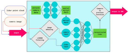 Prototype algorithm architecture; the blue box represents new data processing steps introduced by ARC-LIGHT between sensor readings and spacecraft GNC. Lidar and camera data are input. Image data is processed in initial CNN to determine optical depth of the image in multiple sectors and dehazed to improve signal-to-noise. Lidar data is filtered to remove significant outliers corresponding to strong PSI cloud backscatter. These intermediate quantities are combined in a second CNN to reconstruct the lidar scan without interference. Output is sent to GNC.