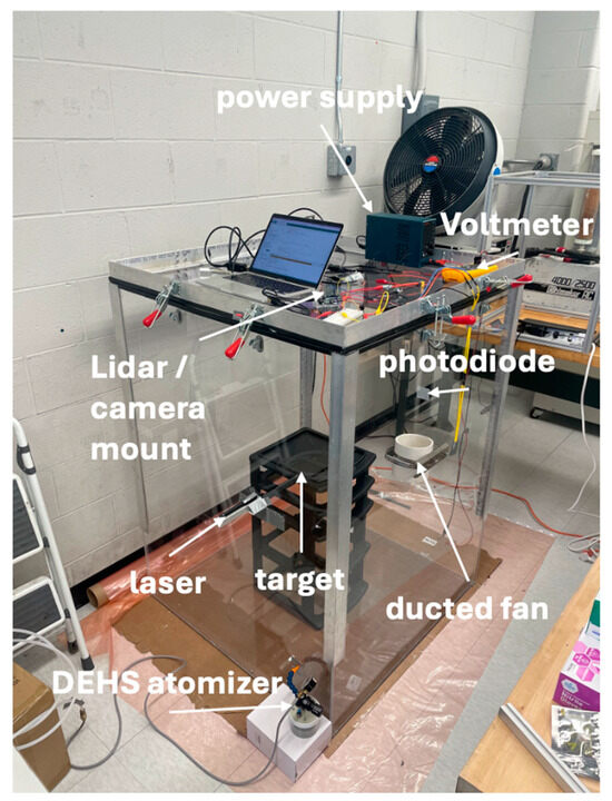 SELENE is composed of a 0.91 × 0.91 × 1.2 m3 sealed acrylic tank with several mounting points for the sensors, fans, laser, photodiode, and atomizer used to simulate and study this optical environment. Figure 4 shows the layout of the experiment. A 2D scanning lidar and camera are mounted on the underside of the removable lid pointed toward the base of the tank. This is to mimic the nadir-pointing sensors used by landers. A 2D lidar was used for prototype simplicity and budget constraints. A target can be placed at the base of the tank: either a model of the lunar surface for image processing-focused experiments or a series of simple blocks for lidar evaluation. The large scale of the experiment is necessitated by the magnitude of the manufacturer-stated accuracy of our lidar, a Hokuyo UST-10LX (Osaka, Japan), which is ±4 cm. A 650 nm laser is mounted on one wall, pointed to a photodiode on the opposite face to measure optical depth.