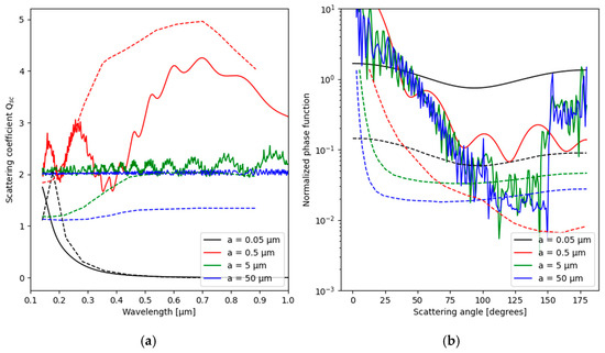 (a) Dimensionless scattering coefficients for irregular regolith grains (dashed) and spherical DEHS droplets (solid) of different radii. (b) Scattering phase function, normalized to the single scattering albedo, of the same size particles for 0.65 μm wavelength light. Regolith data from [40].