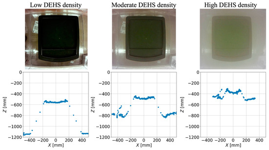 At the top are the example camera images with their respective lidar scans below them from SELENE. DEHS density increases from (left) to (right) panels. The lidar scan crosses the center of the image from top to bottom.