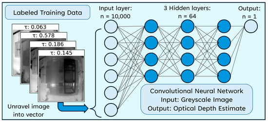A training dataset of hundreds of images taken inside SELENE at different DEHS densities, ambient lighting conditions, and arrangement of objects within the camera field of view was used to train the CNN. Critically, the laser-photodiode system allows us to label this dataset according to the measured optical depth. Figure 7 shows the architecture of the CNN; it accepts a 100 × 100 pixel black-and-white image as input and outputs an estimate of the optical depth. A total of 3 hidden layers of 64 nodes (or “neurons”) each are used, with rectified linear unit (ReLU) activation functions between each hidden layer. A sigmoid activation function is used for the last layer, which ensures the output is a value between 0 and 1, spanning the range of optical depths tested. For each training step (“epoch”), the CNN is fed a training image and returns an estimate of the optical depth . The difference between and the true optical depth τ, the “loss”, is calculated. The network then “learns” by adjusting the weights and biases of each neuron via backpropagation to minimize the loss. As such, the loss of the CNN decreases as it trains, representing convergence toward a solution.