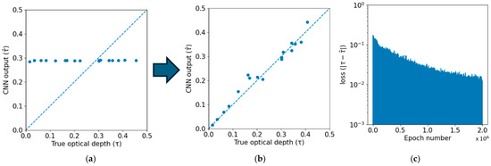 CNN training metrics. (a) CNN estimate of the optical depth for the test data, plotted against the true value before training. (b) CNN estimate of the optical depth for the test data, plotted against the true value after training completes. (c) Plot of CNN loss across the training epochs.