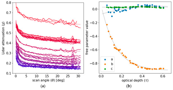 where , , and are free parameters determined by the fitting. These fits are shown as dashed lines on the left panel of Figure 9. The right panel of Figure 9 shows the values of the free parameters as a function of τ. A second set of functions is fit to these free parameters. Together, this allows for the determination of χ as a function of θ and τ for any new lidar scan. The algorithm thus deploys the CNN to compute and uses this output to compute χ at each scan angle θ. Dividing the raw lidar signal by χ gives the projected lidar scan.