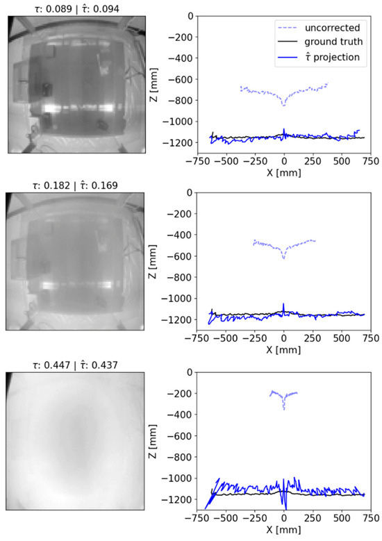 Figure 10 shows three example lidar reconstructions of SELENE’s tank base at different optical depths using this prototype algorithm. The lidar scan corresponds to a slice down the center of the image. In all cases, τ and are similar, indicating the CNN successfully estimates the image optical depth. This is to be expected, given the tight agreement shown in the center panel of Figure 8. The right panels of Figure 10 show the associated lidar scans for each image. The raw scan data, shown as the dashed light-blue line, incorrectly measures the tank base to be closer to the lidar than it is. The black dashed line shows the true distance, as measured when no DEHS is present. The solid blue lines show the lidar scan projected using the CNN output and the lidar attenuation parametrization χ. In all cases, there is good agreement between the ground truth and the projected lidar scan. This indicates this system can estimate the distance to the tank base even at high optical depths where the lidar scan is significantly impacted by the DEHS.