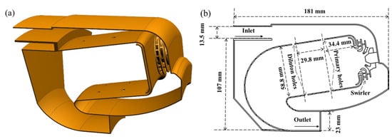 A simplified structure diagram of a reverse-flow combustor. (a) 3D, (b) 2D.