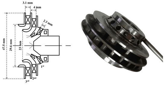 The structure of the swirler is illustrated in Figure 2 and the units are mm. The dome consists of a three-stage swirler and a nozzle. The first-stage swirler features 15 oblique holes with a circumferential angle of 45°. Both the second-stage and third-stage swirlers generate a radial swirling flow, comprising 10 and 24 blades, respectively. The secondary blade angle is 45°, with a swirl number of 1.13, while the third-stage blade angle is also 45°, with a swirl number of 0.57. There are two stages of fuel supply: the pilot stage employs a centrifugal nozzle, and the primary stage utilizes pneumatic atomization.