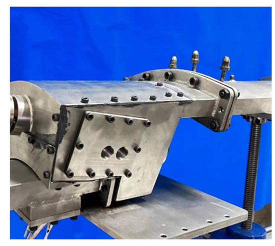 To capture the flow field of the central section of the combustor using particle image velocimetry (PIV), a glass window is installed at the rear end to allow the laser to pass through. Additionally, windows are opened on each side of the combustor; glass is installed on one side to capture the flow field, while the other side is equipped with a mount for the ignition nozzle used in ignition tests. The optical diagnostic setup incorporates a particle image velocimetry system composed of an Nd:YAG laser, a synchronous controller, a high-resolution camera, and a computer. The Nd:YAG laser operates at a wavelength of 532 nm, with a pulse energy of 200 mJ, pulse duration of 8 ns, and a frequency of up to 15 Hz. A MicroPulse 725 synchronous controller provides precise timing with an accuracy of 0.25 ns in TTL format. The high-resolution camera (SM-CCDB4M34), with a resolution of 2048 × 2048 pixels, a frame rate of 34 fps, and a magnification of 2.6 pixels/mm, captures the images (Beijing Lifang Tiandi Technology Development Co., Ltd. Beijing, China). Magnesium oxide particles, with a diameter of 10–12 μm and a density of 3.65 g/cm3, serve as tracers due to their stability, non-combustibility, and effective dispersion, ensuring traceability and optimal light scattering. Velocity fields are calculated using commercial PIV software (MicroVec 3.6.5) with a multi-scale cross-correlation algorithm, employing a final interrogation window size of 16 × 16 pixels and a 50% overlap. The mean velocity field is determined by averaging 200 transient images. The outer casing features a fuel supply pipeline at the dome and a fuel supply mount for sealing purposes. The model of the reverse-flow combustor is depicted in Figure 3.
