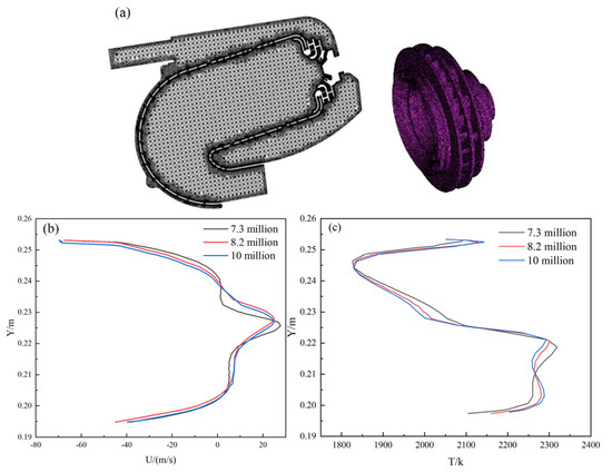 The numerical calculation process starts with grid meshing, which divides the computational domain into structured and unstructured grids. Unstructured grids provide greater flexibility, allowing for precise control over the grid size and node density, which is particularly beneficial for meshing complex regions while ensuring grid quality and computational accuracy. The specific mesh model is displayed in Figure 4a. To evaluate the effects of grid quality and quantity on the results, simulations were performed with three different grid sizes: 7.3 million, 8.2 million, and 10 million girds. The grid refinement in the study was primarily focused on regions around the cooling holes and swirlers. The cooling holes are small in size, requiring localized grid refinement to ensure accurate resolution of flow characteristics. Additionally, the swirlers play a crucial role in the combustor, significantly influencing the flow field structure. Figure 4b shows the radial velocity distribution in the combustor for each grid size. The velocity curves reveal that results for the 8.2 million and 10 million grids are quite similar, while the 7.3 million grid produces noticeably different results. From Figure 4c, it is observed that as the mesh resolution increases, the temperature distribution becomes smoother, with smaller fluctuations. Specifically, the temperature profiles for 8.2 million and 10 million grids are quite similar, indicating that the mesh resolution of 8.2 million provides sufficient accuracy for capturing the temperature distribution in this simulation. Consequently, the 8.2 million grid was selected as the optimal balance between computational cost and accuracy.
