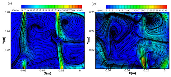 The flow field of experimental and numerical simulation results: (a) simulation, (b) experiment.