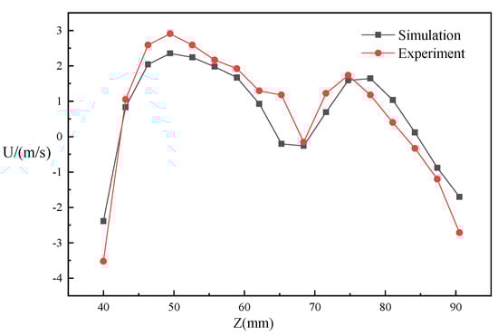 In Figure 6, the comparison between the experimental and simulation results shows discrepancies in the velocity profile along the Z-axis. There are differences between the two sets of data, especially in the regions around 50 mm and 75 mm along the Z-axis. The simulated results show a slightly higher peak in the velocity compared to the experimental data, particularly between 50 mm and 60 mm and, again, between 80 mm and 90 mm. In the experiments, seeding particle behavior in the highly three-dimensional, swirling flow can cause slight deviations in measured velocity, particularly in regions of high shear or turbulence. Additionally, differences in spatial resolution between experimental measurements and the simulation grid may contribute to discrepancies as the simulation may not capture small-scale turbulence effects present in the experiment. Although there are discrepancies between the numerical and experimental results, the differences are relatively small. These small deviations do not significantly affect the validity of the simulation, which still shows a high degree of credibility. The simulation effectively captures the general flow patterns.