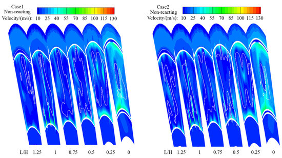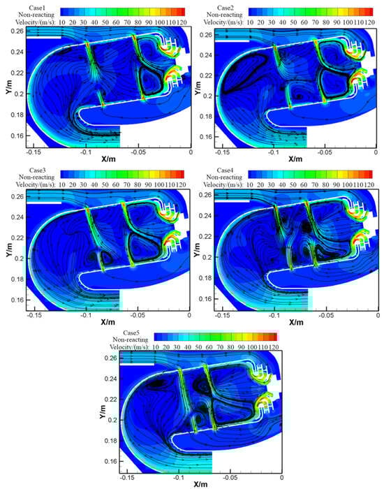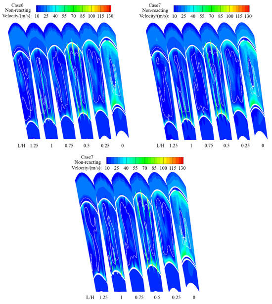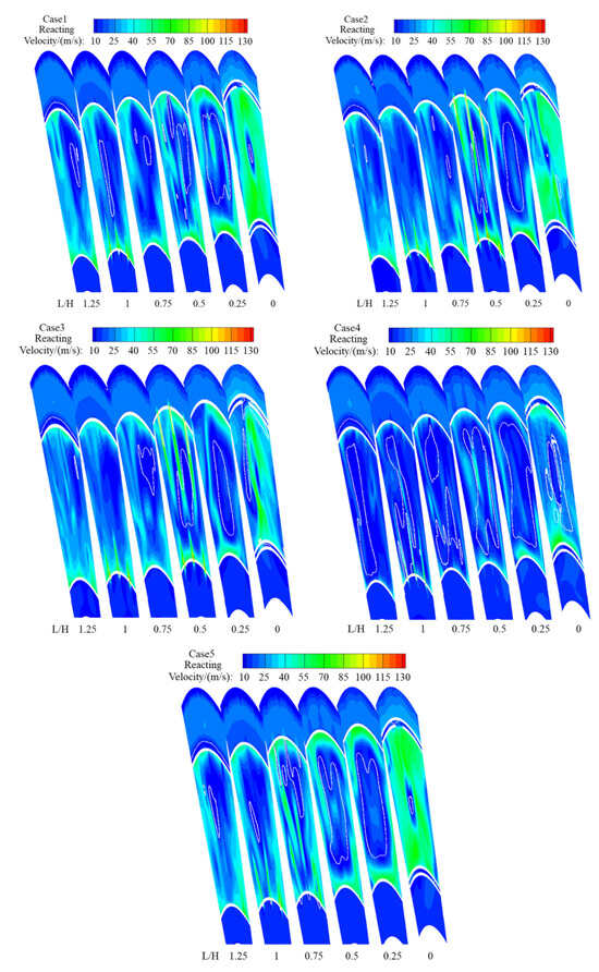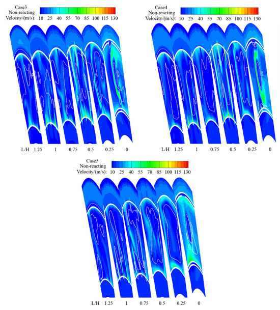 Figure 10 shows the non-reacting velocity field at different cross-sections, with the white line representing the zero-velocity line and delineating the recirculation zone. The extent of the recirculation zone in Cases 1, 2, and 3 is similar, with the maximum range occurring in the primary zone. As the airflow moves downstream, the size of the recirculation zone gradually decreases. In Cases 4 and 5, as the primary holes move downstream, the impact of the primary jets at L/H = 0.25 diminishes, leading to a smoother boundary and a more extensive distribution of the recirculation zone. However, due to the increasing compression effect of the primary jets in the middle zone, the recirculation zone is significantly reduced compared to the other cases, with the recirculation zone in the middle of Case 4 being truncated.