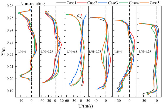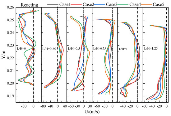 Figure 14 presents the axial velocity distribution at different cross-sections during the reacting state. The overall downstream velocity in the reacting state increases compared to the non-reacting state, as depicted in Figure 9. Additionally, axial velocity asymmetry is aggravated, with the negative axial velocity of the upper primary jet being greater than that of the lower primary jet. At L/H = 0, the forward recirculation velocity at the dome outlet is retracted, reducing the recirculation zone. Among the five cases, Case 4 exhibits the maximum recirculation velocity, while Case 2 shows the smallest recirculation velocity. At L/H = 0.25, all five cases display a unimodal trend distribution, with the peak of the maximum recirculation velocity shifting downward as the position of the primary hole moves backward. The peak position in Case 4 is the lowest due to the reduction in the upstream offset angle of the upper primary jet trail. Conversely, Case 2 has the largest recirculation velocity, indicating that the upper primary jet can quickly participate in the blending and combustion reaction of the primary zone. At L/H = 0.5, the recirculation zone in the lower half of the liner disappears in Cases 1 and 2 due to the high downstream velocity of the lower primary jet. This downstream velocity is the largest in Case 2, bringing it close to the lower liner wall. For Cases 2, 3, and 4, the rearward position of the lower primary hole causes it to be affected by the recirculation zone of the primary zone, maintaining a central recirculation velocity. At L/H = 1, the recirculation velocity remains along the central axis of the liner in Cases 1, 2, and 3, creating a distinct recirculation zone. However, in Cases 4 and 5, the axial velocity shifts downstream. Corresponding to Figure 12, in Cases 1, 2, and 3, the dilution jets produce a certain recirculation flow rate in the middle zone, contributing to the combustion reaction there. In contrast, the downstream deflection angle of the jets is larger in Cases 4 and 5, directing the jets toward the downstream dilution zone.