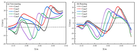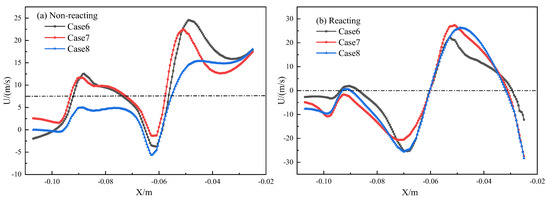 Figure 25 illustrates the axial velocity distribution along the central axis of the liner, with Figure 25a depicting the non-reacting condition and Figure 25b showing the reacting condition. Comparing Figure 25a,b, the range of the central recirculation zone in the primary zone shifts backward, and the overall recirculation zone of the combustor decreases. In the non-reacting state, Case 6 exhibits the highest peak recirculation velocity, while Case 8 shows the lowest peak recirculation velocity. Conversely, in the reacting state, Case 6 has the smallest peak recirculation velocity, and the peak velocity is reduced compared to the non-reacting state. The peak recirculation velocity increases under the other two conditions, with Case 7 showing the largest peak velocity. At axial positions between X = −0.02 m and X = −0.05 m, Case 8 exhibits the highest downstream velocity in the first half of the liner and the largest recirculation velocity in the second half. This indicates that the primary jets in this condition significantly influence the primary zone and fully participate in the reaction in the primary zone.