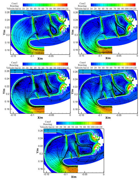 Figure 12 illustrates the distribution of reacting streamlines at various axial positions of the primary holes. The velocity distribution in the reaction state increases significantly compared to the non-reacting state. Additionally, the wake of the jets from the lower primary hole is deflected downstream. The upper primary jet primarily contributes to the combustion reaction in the primary zone, while the lower primary jet influences the combustion reaction in the middle zone. When comparing Cases 1, 2, 3, and 4, the length of the upper and lower primary holes increases progressively as their positions move downstream, with the wake of the upper primary jet in Case 4 nearing the lower liner wall. Concurrently, the recirculation vortex formed by the upper primary jet grows. The deflection angle of the jet trail from the upper primary jet is greatest in Cases 1 and 2, indicating an enhanced fuel-air blending effect at the swirler outlet. Moreover, the range of the recirculation vortex formed by the lower primary jet in these cases is larger than in Cases 3 and 4, resulting in more efficient combustion of fuel in the primary zone. In Case 5, the rearward position of the upper primary hole weakens the swirling effect at the dome. Consequently, the deflection angle of the upper primary jet decreases, and its jet length shortens. However, the range of the recirculation vortex formed by the lower primary jet increases, enhancing the recirculation flow of the lower primary jet, and contributing more significantly to combustion in the primary zone. The combustion range in the primary zone also expands. Furthermore, as the primary hole moves downward across the five cases, the jet length of the lower primary jet gradually increases. This indicates that the axial position of the primary hole affects the interaction of the jet with the swirler, altering the length and trajectory of the jet. Comparing the morphological distribution of the upper and lower primary jets across Cases 1, 2, and 3, there is a notable similarity. In the reacting state, the overall downflow velocity of the combustor increases, causing the jets to deflect downstream relative to the non-reacting state, and the recirculation flow rate of the blended jet in the middle zone decreases. In Cases 4 and 5, the downstream deflection angle of the upper dilution jet trail increases. This is because the lower primary jet approaches the dilution hole, magnifying the downstream velocity effect of the dilution jet. Consequently, the recirculation flow of the dilution jet in the middle zone is almost entirely directed to the dilution zone.