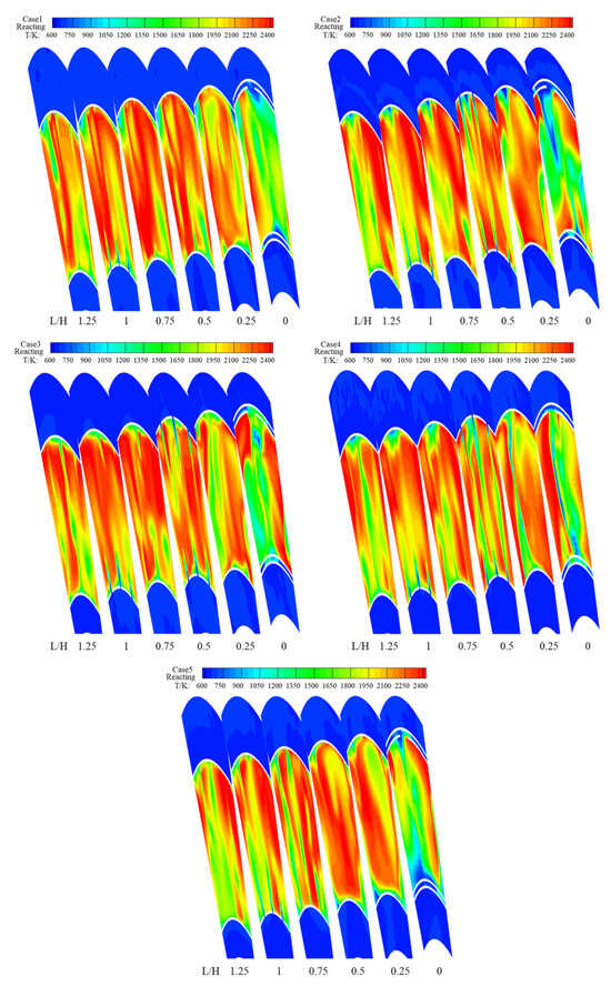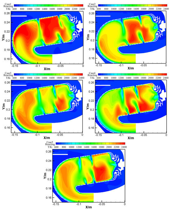 Figure 15 presents the temperature field at different axial positions of the primary holes. As the primary hole moves toward the dome, the range of the high-temperature zone in the main combustion area decreases, while a large high-temperature area appears in the middle zone. Combustion is mainly concentrated in the middle and lower regions of the combustor. At this point, the mixing of fuel and air is relatively insufficient. The combustion process primarily relies on the diffusion combustion mechanism, resulting in incomplete combustion and confinement of the high-temperature area to a localized region. When the primary holes are close to the dome, the effect of the recirculation zone becomes more significant. The altered flow field in the combustor results in a smaller recirculation zone, which is not conducive to stabilizing the flame or evenly distributing heat. Unburned gas mixtures from the primary zone move to the middle zone for reaction, causing the high-temperature area to expand downstream and increase in the middle zone. As the primary holes move downstream, the high-temperature area of the primary zone gradually increases. Compared to the benchmark scheme, Case 3, positioning the primary holes further downstream enlarges the recirculation vortex in the main combustion area. This allows sufficient time for fuel and gas to mix, leading to initial fuel and air mixing in the main combustion area. As a result, the degree of premixing increases, raising the temperature in the combustion zone. The main combustion reaction area gradually moves closer to the dome, concentrating the high-temperature area upstream while lowering the temperature downstream.