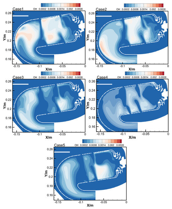 Figure 16 shows the distribution of OH radicals in the combustion chamber for five different cases (Case 1 to Case 5). OH is widely recognized for its strong correlation with high-temperature reaction zones and is a reliable indicator in turbulent combustion environments. It is found that the position of the primary hole significantly affects the distribution of OH radicals within the combustor. In Case 1 where the primary hole is close to the swirler, the OH concentration is notably higher in the middle and dilution zones. At this point, the fuel and air mixing space in the primary zone is limited, and some unburned fuel follows the airflow to the middle and dilution zones, leading to a broad distribution of OH radicals. In Case 2 where the primary hole is slightly further from the swirler, the OH concentration decreases compared to Case 1, with a slight shift in the combustion zone. However, high concentrations of OH are still present in the middle and dilution zones. In Case 3, as the primary hole moves further away from the swirler, the OH concentration continues to decrease, and the flame front becomes more dispersed. The distribution of OH radicals contracts, with the peak concentration shifting further back, indicating a slower combustion process. In Case 4, the distribution of OH radicals contracts significantly, with the primary hole moving even further from the swirler. There is no distinct localization of OH concentration. Finally, in Case 5 where the primary hole is far from the swirler, the size of the primary zone increases. The strong airflow generated by the swirler ensures sufficient mixing of fuel and air, and OH is primarily concentrated in the primary zone.