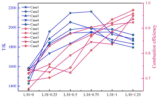 The temperature and combustion efficiency at different cross-sectional positions are shown in Figure 18. From the figure, it is found that as L/H increases from 0 to 1.25, and the temperature in all cases (Case 1 to Case 5) generally exhibits an increasing trend followed by a decrease. Specifically, at low L/H positions (near the swirlers), the temperature is relatively low, and as L/H increases, the temperature begins to rise, indicating an improvement in combustion efficiency and a gradual stabilization of the airflow. As the primary hole moves further away from the swirler, the rate of temperature increase gradually decreases. For instance, Case 1 and Case 2 show more significant temperature changes, while in Case 3, Case 4, and Case 5, the temperature increase slows down as the primary jet hole moves away from the swirler, with a temperature decrease occurring at L/H = 0.75. Regarding combustion efficiency, in Case 1, at L/H = 0, the combustion efficiency is low, approximately 0.70, and as L/H increases, the efficiency significantly improves, reaching its maximum value near L/H = 1.25. Case 2 shows a similar trend but with a smaller improvement range, especially at L/H = 0 and 0.25 where the combustion efficiency is lower, around 0.75. At L/H = 1.25, the efficiency approaches its maximum value of approximately 0.90, with a steady increase. Case 3 exhibits a smaller improvement, with the highest efficiency at L/H = 1.25 being about 0.87. Compared to Case 1 and Case 2, the combustion efficiency increases more slowly. Cases 4 and 5 display similar trends, with combustion efficiency being low (around 0.65–0.70) at L/H = 0 and increasing significantly as L/H increases, particularly in Case 5 where the efficiency approaches 1.00 at high L/H values, demonstrating a more uniform combustion effect.