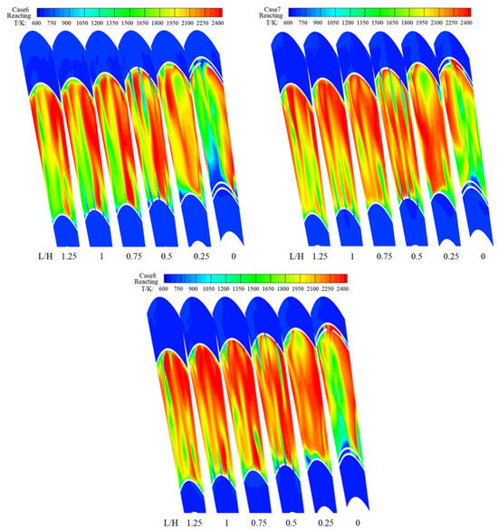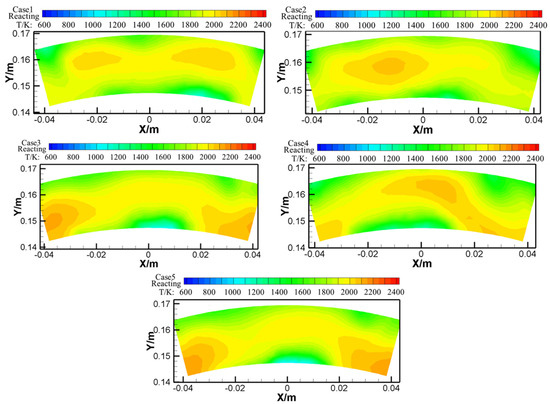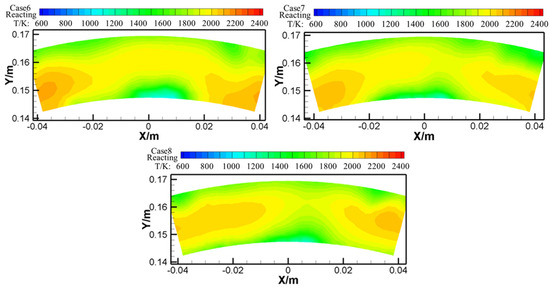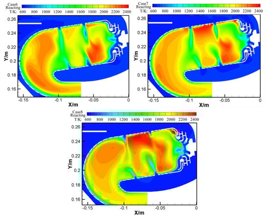Figure 30 shows the temperature field in different cross-sections at various primary hole diameters. In Case 8, the high-temperature area of the primary zone and the middle zone is greater than in the other cases. The high-temperature area in Case 6 is relatively small, with a noticeable range of low-temperature areas in the primary zone. This indicates that the fuel-rich area in the primary zone accounts for a large proportion in this case, and the fuel–air blending effect of the upper primary jet participating in the primary zone is poor.