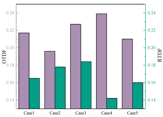 Figure 20 shows the outlet characteristics of the combustor. According to the OTDF, Case 2 has the best OTDF, followed by Cases 1 and 5, while Cases 3 and 4 have the worst OTDF. Regarding the RTDF, Cases 1, 2, and 3 have higher RTDF values, whereas Cases 4 and 5 have the lowest. Combined with the high-temperature distribution shown in Figure 17, moving the primary holes forward improves the OTDF of the combustor. This is because the closer the primary hole is to the dome, the better the primary jets can participate in the fuel and air blending in the primary zone. The proportion of fuel-rich mixture in the primary zone gradually decreases, approaching the stoichiometric ratio. Although the scope of the primary zone is reduced, the evenly mixed high-temperature gas in the primary zone can burn more fully in the middle zone. When the primary holes move further downstream, the jet wake of the upper primary hole gradually approaches the lower wall of the liner, occupying almost the entire primary zone. Additionally, the upstream offset angle becomes smaller, reducing the recirculation flow rate involved in fuel-air blending, resulting in a high fuel/air-ratio distribution in the primary zone. Concurrently, the recirculation vortex combustion range formed by the lower primary jet is squeezed and reduced, allowing the high fuel/air-ratio mixture to continue burning fully in the middle zone. However, as the combustion range of the middle zone becomes smaller, the gas continues to burn in the dilution zone, generating a large high-temperature area at the outlet, which worsens the OTDF. When the rear position of the primary holes exceeds a certain range, as in Case 5, the upper primary jet is attenuated by the swirling action of the dome. At this point, the recirculation zone formed by the primary jets increases within the primary zone, expanding its combustion range. Even though the range of the middle zone is reduced, the combustion conditions in the primary zone are more adequate compared to Cases 3 and 4, resulting in a relatively better OTDF.