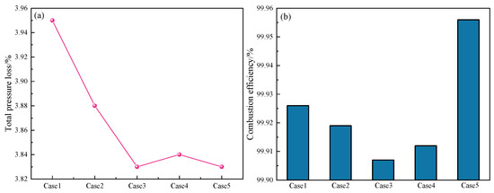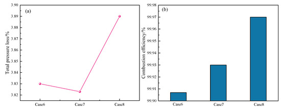 The total pressure loss and combustion efficiency for different cases are shown in Figure 33. Figure 33a represents the total pressure loss, while Figure 33b shows the combustion efficiency. As can be seen, Case 8 exhibits the highest total pressure loss, and the change in the primary hole diameter affects the formation of the recirculation zone in the combustor. From Figure 26, it is found that the airflow inside the combustor in Case 8 is more likely to form vortices and recirculation zones. In the case of smaller diameters, the intensity of vortex formation increases, the airflow path becomes more complex, and the stability of the flow decreases, leading to an increase in local flow losses. The expansion of the recirculation zone increases the length of the flow path inside the combustor, resulting in higher energy dissipation, which further increases the total pressure loss. Additionally, the smaller diameter of the primary makes it harder for the airflow to rapidly diffuse in the primary zone. The compression and contraction effects of the airflow increase flow resistance, and the velocity differences between the inlet and outlet of the flow intensify local turbulent flow, further increasing the resistance, which leads to an increase in total pressure loss. Figure 33b shows the combustion efficiency for different primary hole diameters. It can be observed that the combustion efficiency is the highest in Case 8, indicating that reducing the diameter of the upper primary hole promotes combustion reactions in the primary zone while also improving the overall combustion efficiency of the combustor. Overall, as the diameter of the primary hole decreases, the combustion efficiency and reaction intensity gradually increase. Smaller diameters help improve the mixing of fuel and air, enhancing combustion stability. By optimizing the diameter of the primary hole, the combustion efficiency and temperature distribution inside the combustor can be effectively improved, further enhancing the stability and performance of the combustion process.
