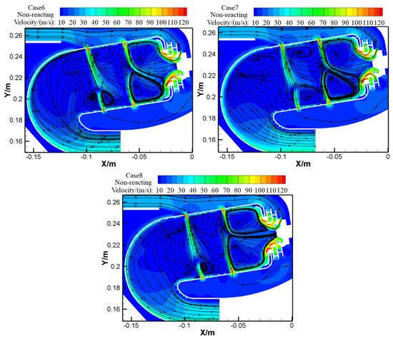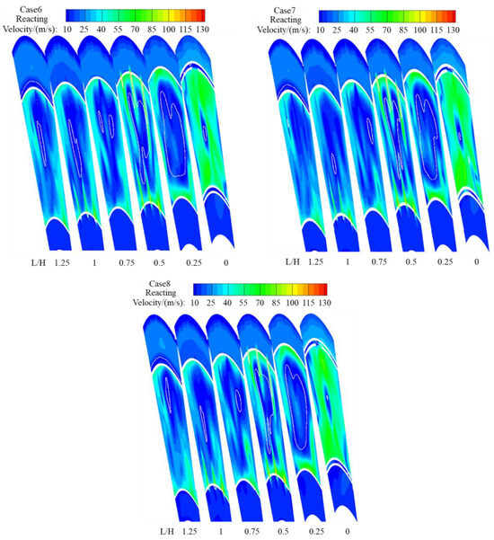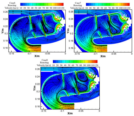 Figure 26 illustrates the distribution of reacting streamlines at various primary hole diameters. Comparing the jet patterns in the primary zone across the three cases, there is a significant difference in flow field distribution compared to the non-reacting state. As the primary hole diameters decrease, the jet length of the upper primary jet shortens. However, the deflection angle of the jet wake upstream gradually increases, bringing the jet wake closer to the swirler outlet and the central axis of the liner. The results indicate that the upper primary jet in Case 8 can better participate in dome fuel and air blending. Simultaneously, the recirculation vortex formed by the lower primary hole gradually increases, allowing for more complete fuel combustion in the primary zone. As the primary hole diameters increase, the jet length also increases, thus exerting a greater influence on the flow field in the middle zone. In Case 6, a recirculation vortex forms between the dilution jets. With the increasing length of the jet in the lower primary hole, the range of the recirculation vortex gradually decreases until it disappears.