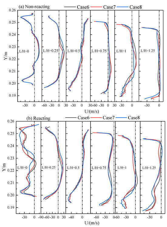 Figure 24 illustrates the axial velocity distribution across different cross-sections, with Figure 24a depicting the non-reacting condition and Figure 24b showing the reacting condition. Under non-reacting conditions, the axial velocity exhibits a single peak at the position of L/H = 0.25. Variations in the size and radial distribution of the peak velocity are observed. Since the primary jet significantly influences the velocity distribution of the primary zone, Case 6 exhibits the largest peak velocity, indicating that larger primary hole diameters result in higher jet velocities. In Case 8, the upper primary jet is shorter, and the recirculation zone is smaller, leading to a higher maximum recirculation velocity at the radial position. The axial velocity distribution at other locations is consistent, corroborating the non-reacting velocity streamline distribution shown in Figure 22. Under reacting conditions, at L/H = 0, the asymmetry in the axial velocity distribution at the swirler outlet increases, reducing both recirculation velocity and the extent of the recirculation zone. In this scenario, Case 6 exhibits the highest peak velocity, while Case 8 has the lowest peak recirculation velocity. At L/H = 0.25, the recirculation velocities in both Case 7 and Case 8 are the largest. Comparing the axial velocity distribution between the non-reacting and reacting states reveals that the overall recirculation range and recirculation velocity decrease under reacting conditions.