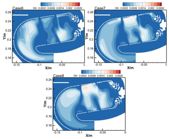 The distribution of OH radicals for different cases is shown in Figure 29. It can be observed that as the size of the primary hole decreases, the OH distribution in the combustor changes significantly. In Case 6 where the primary hole has a larger diameter, the OH radical distribution is broader, especially near the lower recirculation vortex and the dilution zone. The larger hole size allows for a larger airflow, which carries the fuel into the lower recirculation vortex. In Case 7, as the primary hole diameter decreases, the OH distribution undergoes a noticeable change. The OH concentration in the middle zone of the combustor increases significantly. The reduction in hole size leads to lower airflow kinetic energy, which, in turn, reduces the mixing efficiency between fuel and air. The airflow from the primary hole is unable to draw the fuel into the recirculation zone, and thus, OH radicals are concentrated near the primary hole and the recirculation zone. In Case 8 where the primary hole is the smallest, the OH distribution becomes more localized. The concentration of OH is more focused between the recirculation zone and the middle zone. The smaller hole size reduces the fuel flow and lowers the airflow speed. This results in the airflow pulling fuel into the middle zone. The higher concentration of OH radicals significantly enhances the temperature and reaction intensity in the combustion region. As a result, the OH distribution narrows further, concentrating in the core region of the combustor.