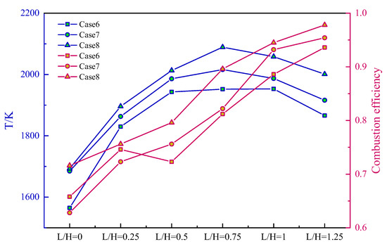 The temperature and combustion efficiency at different cross-sectional positions are shown in Figure 31. As can be seen from the figure, at L/H = 0, Case 6 has the lowest temperature, approximately 1700 K, while the temperature in Case 8 is slightly higher, near 1750K. This indicates that as the primary hole diameter decreases, the mixing of airflow and fuel improves during combustion, resulting in a slight increase in temperature. As L/H increases, the temperature in Case 6, Case 7, and Case 8 shows a gradual upward trend, with Case 7 and Case 8 exhibiting a relatively larger temperature rise. Particularly at L/H = 0.25, the temperature in Case 7 and Case 8 exceeds 2000 K, while the temperature in Case 6 remains slightly lower, around 1900 K. This suggests that reducing the diameter of the primary hole enhances combustion efficiency, making the mixing of airflow and fuel more complete. At L/H = 1.25, Case 8 reaches its highest temperature, close to 2100 K, while the temperature in Case 7 and Case 6 decreases slightly. In summary, reducing the upper primary hole diameter helps increase combustion temperature, especially at larger L/H values, with Case 7 and Case 8 showing higher temperatures. For combustion efficiency, at L/H = 0, all cases have relatively low combustion efficiency, especially in Case 6 (with the largest primary hole diameter) where the efficiency is about 0.65. In contrast, Case 7 (with a slightly smaller diameter) and Case 8 (with the smallest diameter) have slightly higher efficiencies, approaching 0.70. This suggests that when the primary hole diameter is large, the mixing of fuel and air is poor, leading to lower combustion efficiency. As L/H increases (across different sections of the combustor), the combustion efficiency of all cases gradually rises. Particularly in Case 8, as the primary hole diameter decreases, the combustion efficiency improves significantly, reaching nearly 1.00 at L/H = 1.25. This indicates that smaller primary hole diameters contribute to more complete combustion, enhancing combustion efficiency.