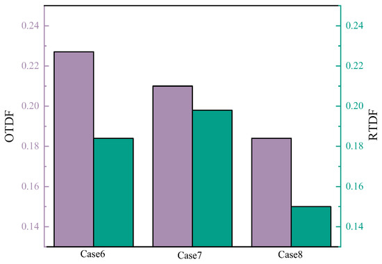 Figure 34 depicts the outlet characteristics of the combustor. As the upper primary hole diameter gradually decreases, the OTDF also decreases, with Case 8 exhibiting the smallest OTDF. The results indicate that reducing the upper primary hole diameter can effectively improve the OTDF while maintaining the flow proportion of the primary hole. Additionally, the RTDF in Case 8 is the smallest, which is consistent with the distribution of high-temperature areas in different cross-sections shown in Figure 30. A larger high-temperature area closer to the dome suggests more efficient combustion in the primary zone, thereby reducing the generation of high-temperature areas at the combustor outlet.