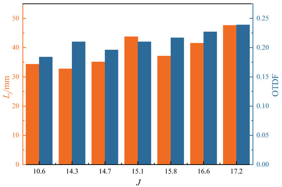 Figure 35 shows the variation patterns of the momentum flux ratio, jet penetration depth, and outlet temperature distribution coefficient. It can be seen that as the momentum flux ratio increases, the jet penetration depth initially increases and, then, gradually stabilizes. In particular, when the momentum flux ratio increases from 10.6 to 15.1, there is a noticeable increase in the jet penetration depth. However, after further increasing the momentum flux ratio (from 15.8 to 17.2), the jet penetration depth tends to stabilize, with smaller fluctuations. The increase in momentum flux ratio leads to a deeper mixing jet, but as the ratio increases, the rate of increase in jet penetration depth gradually decreases. As the momentum flux ratio increases, the jets on both sides collide, and the interaction between the jets at the center of the liner affects the penetration depth. On the other hand, OTDF increases with the momentum flux ratio, indicating that the temperature distribution at the combustor outlet becomes more uneven. As the momentum flux ratio increases, the airflow penetration capability strengthens, making the mixing of air and fuel more difficult. This creates localized high and low-temperature zones within the combustion region, leading to a decline in the quality of the outlet temperature distribution. Each combustor has an optimal flow distribution and momentum ratio range, which provides sufficient jet penetration depth while ensuring that the interaction between the upper and lower jets occurs in the main section of the jet, without affecting the instability vortex structure in the jet core. For the reverse-flow combustor studied in this paper, the optimal momentum ratio is between 10.6 and 14.7, with the corresponding penetration depth ranging from 34.3 mm to 35.1 mm, which results in a better outlet temperature distribution.