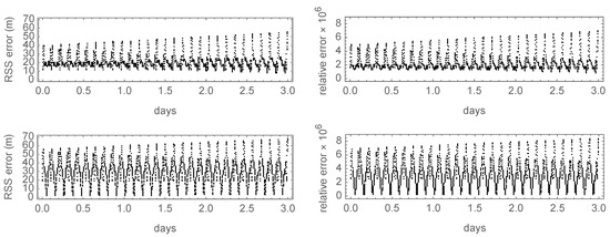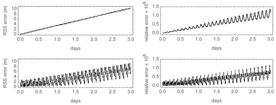 After computing the semianalytical, first-order solution in Delaunay variables, the output is transformed into Cartesian coordinates, from which we compute the Root Sum Square (RSS) of the errors with respect to the true orbit. As shown in Figure 1, the errors of the coordinates are dominated in both cases by the inaccuracies resulting from the truncation of the mean-to-osculating transformation to first-order effects. For this short propagation interval, these periodic components conceal the contribution of the errors stemming from the second-order truncation of the mean variations, which soon or later will dominate the scenario. Rather than extending the propagation interval to show the preeminence of the latter, in the next section, we will refine both semianalytical solutions with higher-order terms that disclose this effect.