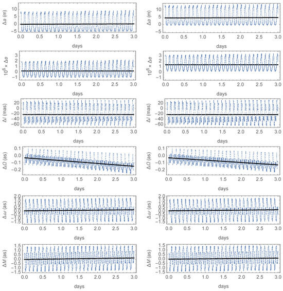 Figure 2 displays the errors of the osculating elements obtained with the first-order theories, superimposed to linear fits to them. The only relevant differences between the two distinct theories are observed for the semimajor axis and for the eccentricity, whose errors in the three-day interval are presented in the first and second rows of Figure 2, respectively. For the former, the secular growth of the errors is of about 8 cm/day in both cases. However, the errors stemming from the noncanonical theory average just a few cm, whereas this average notably shifts to about 5 m in the case of the canonical solution—approximately two orders of magnitude higher. The behavior of the errors is analogous regarding the eccentricity, showing similar secular trends in both theories, of about /day. In this case, the increase in the average error obtained with the canonical solution is only about one order of magnitude larger than in the noncanonical case, yet clearly observable too. As with the coordinates, the amplitudes of the periodic errors affecting the orbital elements always dominate the picture, with the exception of the right ascension of the ascending node, where a secular trend of a few hundredths of an arc second per day is clearly apparent in the time histories obtained in both cases with periodic oscillations of about one tenth of as, as shown in the fourth row of Figure 2. Similar trends certainly exist in the time histories of the errors of and M, shown in the fifth and sixth rows of Figure 2, respectively, but they remain hidden in the figures due to the size of the periodic components of the errors of these two elements, whose amplitudes are about one order of magnitude larger than in the case of the right ascension of the ascending node. Finally, the behavior of the inclination errors is almost identical in the two theories, as shown in the graphics displayed in the third row of Figure 2, with very small secular trends whose rate falls below the mas/day whereas the amplitude of the periodic components of the errors is of just a few hundredths of as in both case. So, in spite of the comparable accuracy for ephemeris computation of the first-order solutions, the characteristic feature of the noncanonical theory of providing a better agreement with the true dynamics than the canonical case is clearly illustrated for the orbital elements with this example.