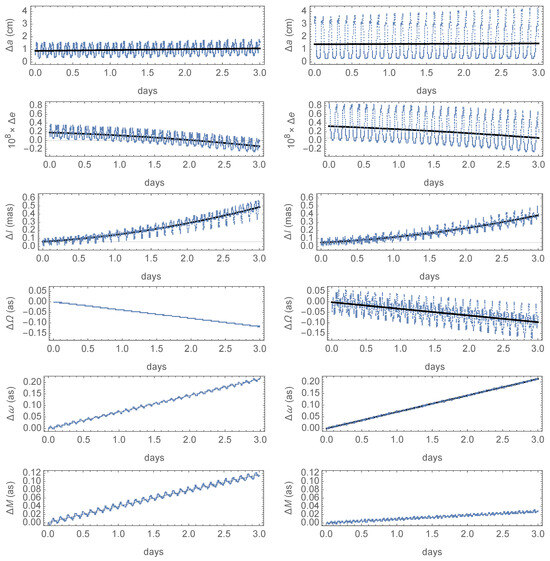 Regarding the errors of the osculating elements, the basic features shown by the first-order theories remain. However, the shifts from the zero average of the errors of the semimajor axis are now in the cm level in both cases, as clearly observed in Figure 4. While the errors in the semimajor axis are now of the same order of magnitude, a small bonus still goes to the side of the noncanonical case. More precisely, the average of the errors in the semimajor axis provided by the noncanonical theory falls slightly below the cm level, with insignificant periodic oscillations, compared to an average of about 1.5 cm in the canonical case, with periodic oscillations of much wider amplitude (see plots in the first row of Figure 4). The secular trend of the errors of the semimajor axis still exists but is negligible in both cases, falling below the mm/day level, yet with a lower slope on the side of the canonical theory.