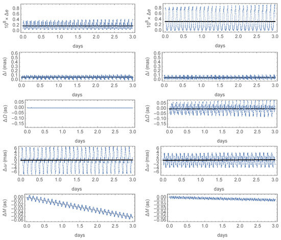 an inversion that can be approached in different ways [72,73,74,75]. However, when the truncation of the mean-to-osculating transformation is one order lower than that of the mean variations, an initialization process based on Equation (17) will introduce errors of the order of , which are critical in the computation of the mean frequencies, and hence for the significance of a numerical integration of the mean variations based on them. In particular, inaccuracies in the initialization of the mean motion in mean variables caused by this reason unavoidably yield the rapid growth of in-track errors [76,77]. Maintaining in-track accuracy requires the proper initialization of the mean motion in mean variables. This operation is routinely carried out either by a fit of the mean frequencies to a preliminary numerical integration of the osculating variations for just a few orbits, or by the calibration of the semimajor axis by other means [70]. Remarkably, the calibration process is unnecessary for perturbation approaches based in the extended phase space formulation [55,60,78].