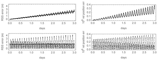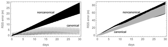 Still with reference to Figure 1, we observe that the noncanonical solution seems slightly more accurate than its canonical counterpart for this particular example, with a root mean square error of m for the noncanonical theory as opposed to the m obtained in the canonical case. Nevertheless, both semianalytical solutions achieve the expected accuracy of a properly calibrated first-order solution along this time interval, with relative position errors , thus resulting in comparable performance regarding ephemeris (coordinate) computation.