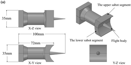 Taking the three-dimensional model of the HVP cited in Reference [22] as the research object, this projectile consists of three components: the upper sabot segment, the lower sabot segment, and the flight body. The flight body has a conical structure with a spherical nose. The sabot has a special-shaped structure, with the upper and lower sabot segments being mirror-symmetric. This projectile is accelerated from rest to 2501 m/s, approximately Mach 7.2, within 2.19 ms by electromagnetic forces [22]. The detailed geometric parameters of the projectile are not disclosed in Reference [22]. The modified model made in the current work and the detailed geometry are shown in Figure 1.