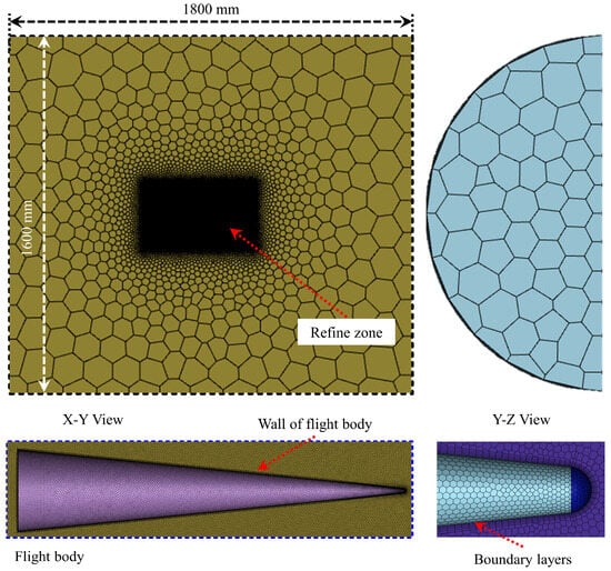 The half-model is used in this study to improve calculation efficiency. According to the composition of the model, the grid is divided into three parts: the background grid containing the flight body, the sub-grid containing the upper sabot segment, and the other sub-grid containing the lower sabot segment. The polyhedral meshing method is used to mesh the model, and local refinement is carried out. By controlling the height of the first layer of wall grids, the y+ is ensured to be from 30 to 300. The meshed grids are shown in Figure 2 and Figure 3.