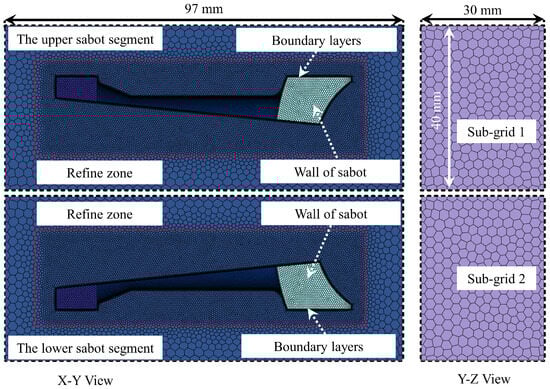 Figure 2 shows the background grid. The background grid contains the flight body. The background grid area is a cylinder with a length of 1800 mm and a radius of 800 mm. Considering the movement of the sabot, local refinement is carried out in the areas involved in the movement of the upper and lower sabot segments in the background grid. The number of polyhedral grid elements in the background grid is about 1 million, the minimum grid size is 0.05 mm, and the maximum is 150 mm. The sub-grids contain the sabot segments, and the sub-grid area is a cuboid with a length of 97 mm, a width of 40 mm, and a height of 30 mm, as shown in Figure 3. Local refinement is carried out on the grids near the wall surfaces of the sabot. Sub-grids are symmetric about the X–Z plane. The number of polyhedral grid elements in one sub-grid is about 0.2 million, the minimum grid size is 0.05 mm, and the maximum is 4 mm.