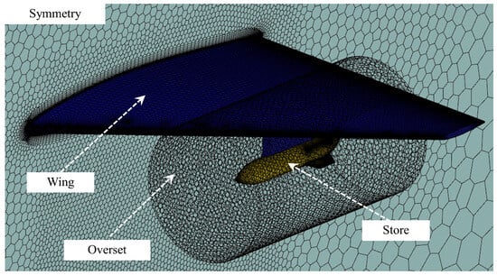 The “wing-pylon-finned-store” (WPFS) multi-body separation standard model is adopted to verify the overset grid method used in this study, as shown in Figure 4. The wing has a semi-span of 6.6 m, the diameter of the store is 0.508 m, the length is 0.85 m, and the mass is 907.8 kg. The incoming flow velocity in the test is Mach 0.95, and the flight altitude is 8.0 km. More test details can be found in reference [34,35]. Figure 5 shows the test and calculation results. By referring to the numerical results in previous studies [36,37,38,39], the consistency of the calculation and test results presented in this paper validates the reliability of the method.