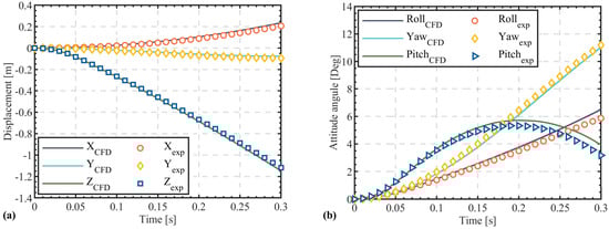 Comparison of experimental results and the calculation result: (a) displacement; and (b) attitude angle.