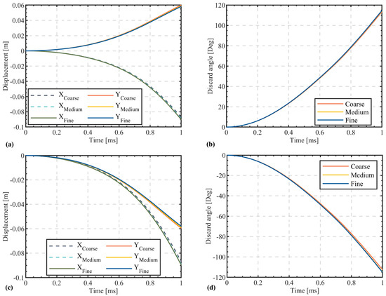 In the symmetric sabot discard, the sabot’s displacements and discard angles are shown in Figure 6, and the three curves match very well. It is important to clarify that the term ‘discard angle’ is utilized to refer to the pitch angle. According to the results, it can be concluded that the medium grid selected in this study meets the requirements for grid independence.