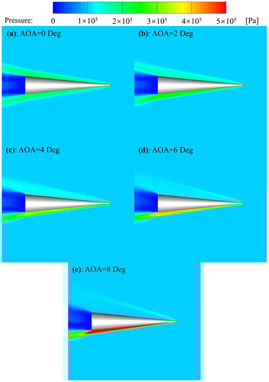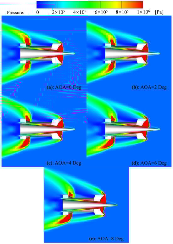 Pressure contour of the flight body: (a) AOA = 0 Deg; (b) AOA = 2 Deg; (c) AOA = 4 Deg; (d) AOA = 6 Deg; and (e) AOA = 8 Deg.