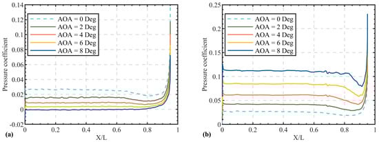Pressure distribution on the surface of the sabot at different AOAs and t = 0 ms: (a) the upper sabot segment; and (b) the lower sabot segment.
