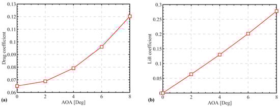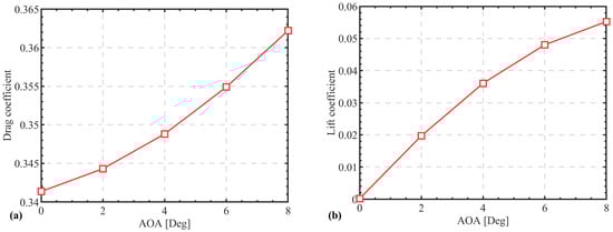 The AOA causes significant changes in the pressure distribution on the flight body’s surface, as shown in Figure 8. It further affects the aerodynamic forces of the flight body. Figure 9 presents the relationship between the drag and lift coefficients of the body and the AOA. Notably, the lift coefficient exhibits a nearly linear increase with the AOA, while the drag coefficient demonstrates a nonlinear increase.